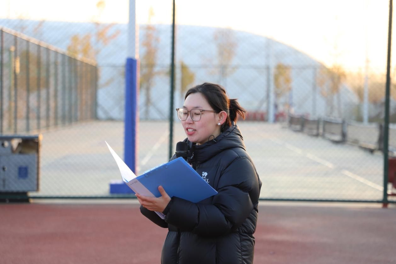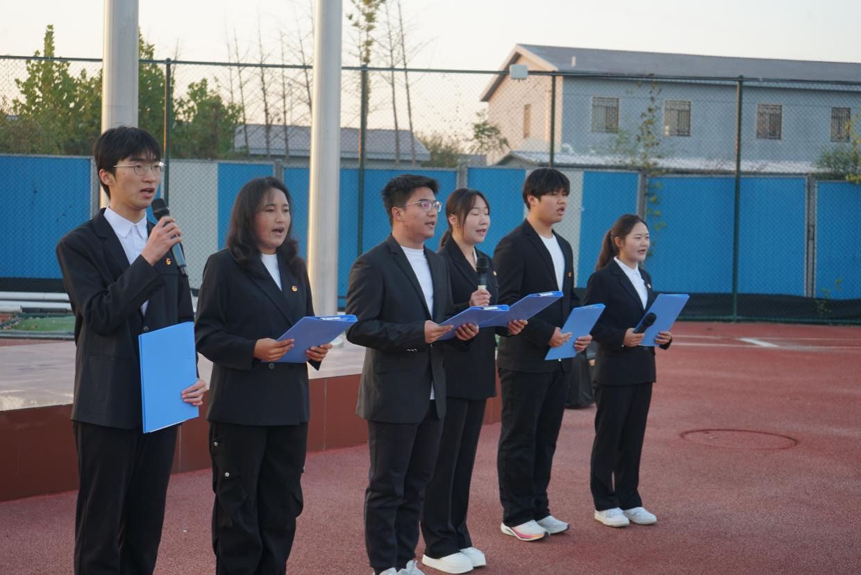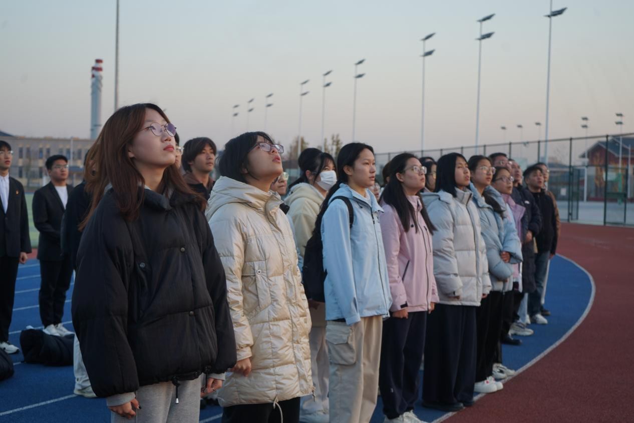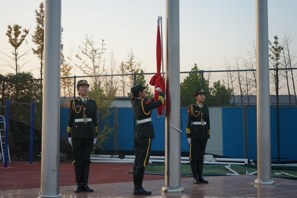 霞光初照,国旗护卫队有力的口令声划破长空,迈着铿锵有力的步伐,护送五星红旗。随着国歌响起,护旗手挥臂展旗,五星红旗与朝阳一同冉冉升起。全体师生神情庄重,行注目礼,齐声高唱国歌,在晨光中凝聚起对祖国的热爱与崇高敬意。