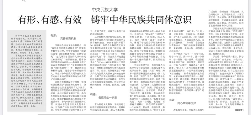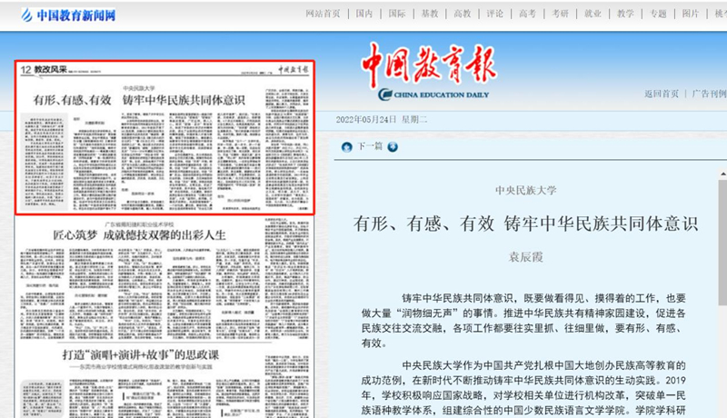 5月24日,《中国教育报》刊发了在线体育博彩 党委副书记袁辰霞撰写的《有形、有感、有效铸牢中华民族共同体意识》一文。