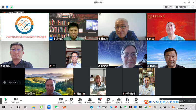 5月30日在线体育博彩 采用线上方式召开2022版本科专业培养方案修订的评审会议,体育博彩 教授委员会委员钟进文、艾尔肯·阿热孜、杨春、姜镕泽、扎巴、叶尔达、陈国光、阮宝娣、努尔巴汗·卡力列汗参加会议并进行审议,金青龙副院长做了汇报。会议由钟进文主持。