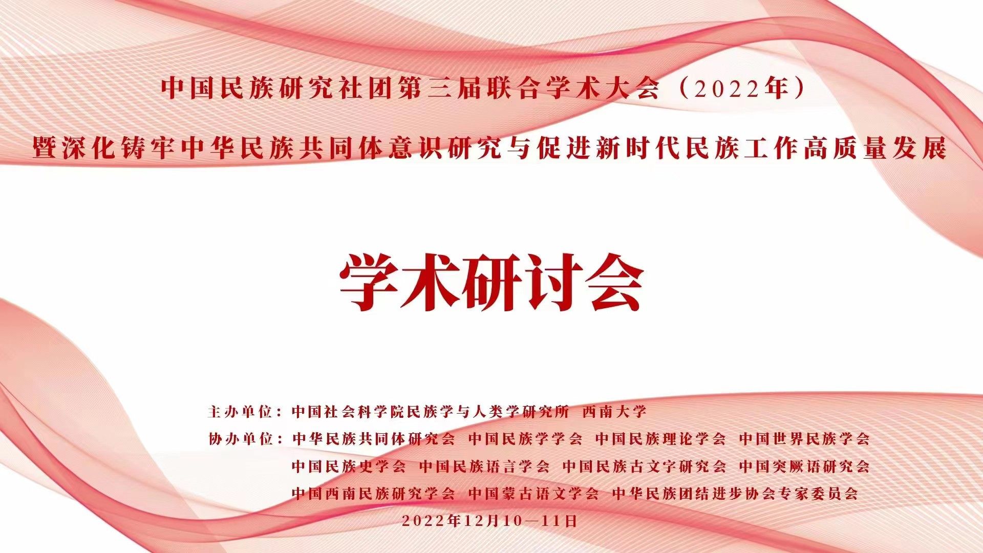 中国民族研究社团(11个社团)第三届联合学术大会(2022年)暨深化铸牢中华民族共同体意识研究与促进新时代民族工作高质量发展学术研讨会2022年12月10-11日在西南大学召开。